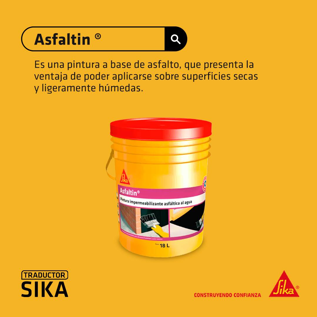 * ASFALTIN es una pintura a base de asfalto dispersada en agua, monocomponente, que presenta la ventaja de poder aplicarse sobre superficies húmedas y secas, de fácil aplicación y alto rendimiento.